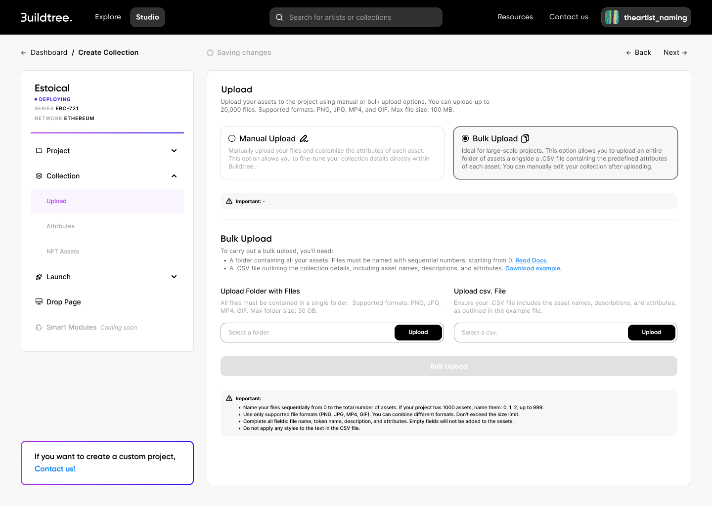 The Bulk Upload feature in Buildtree is designed to streamline the process of uploading multiple assets for your NFT projects. If you are launching a large-scale collection with hundreds or thousands of assets, this tool allows you to upload your artworks and their associated metadata (names, descriptions, attributes) in one single action.