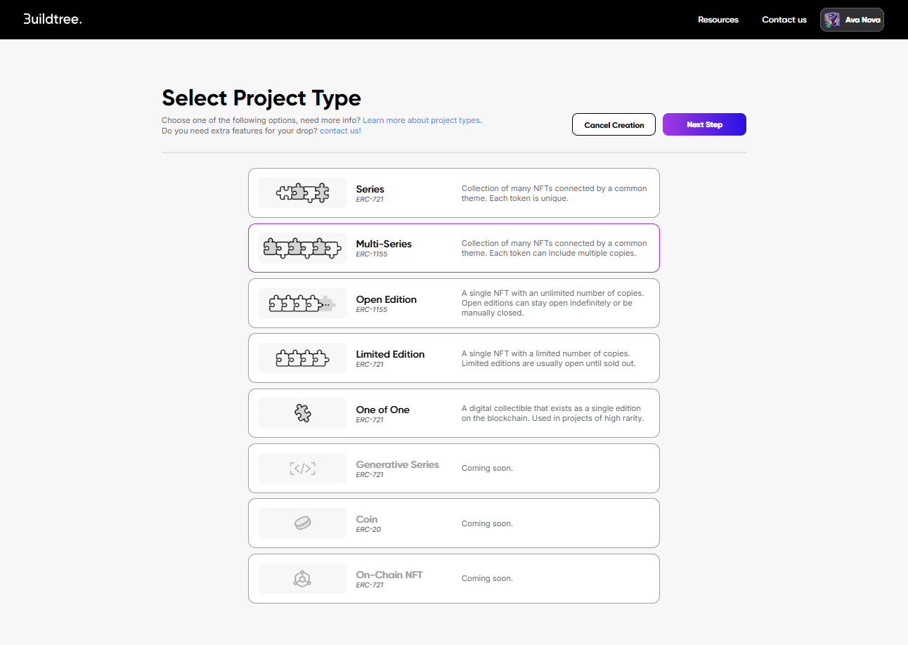 Select the project type that best aligns with your collection and creative vision. Each type offers a unique way to express your art and engage with collectors. Your choice will define the experience you provide to your audience, so explore your options and pick the one that feels right for your project.