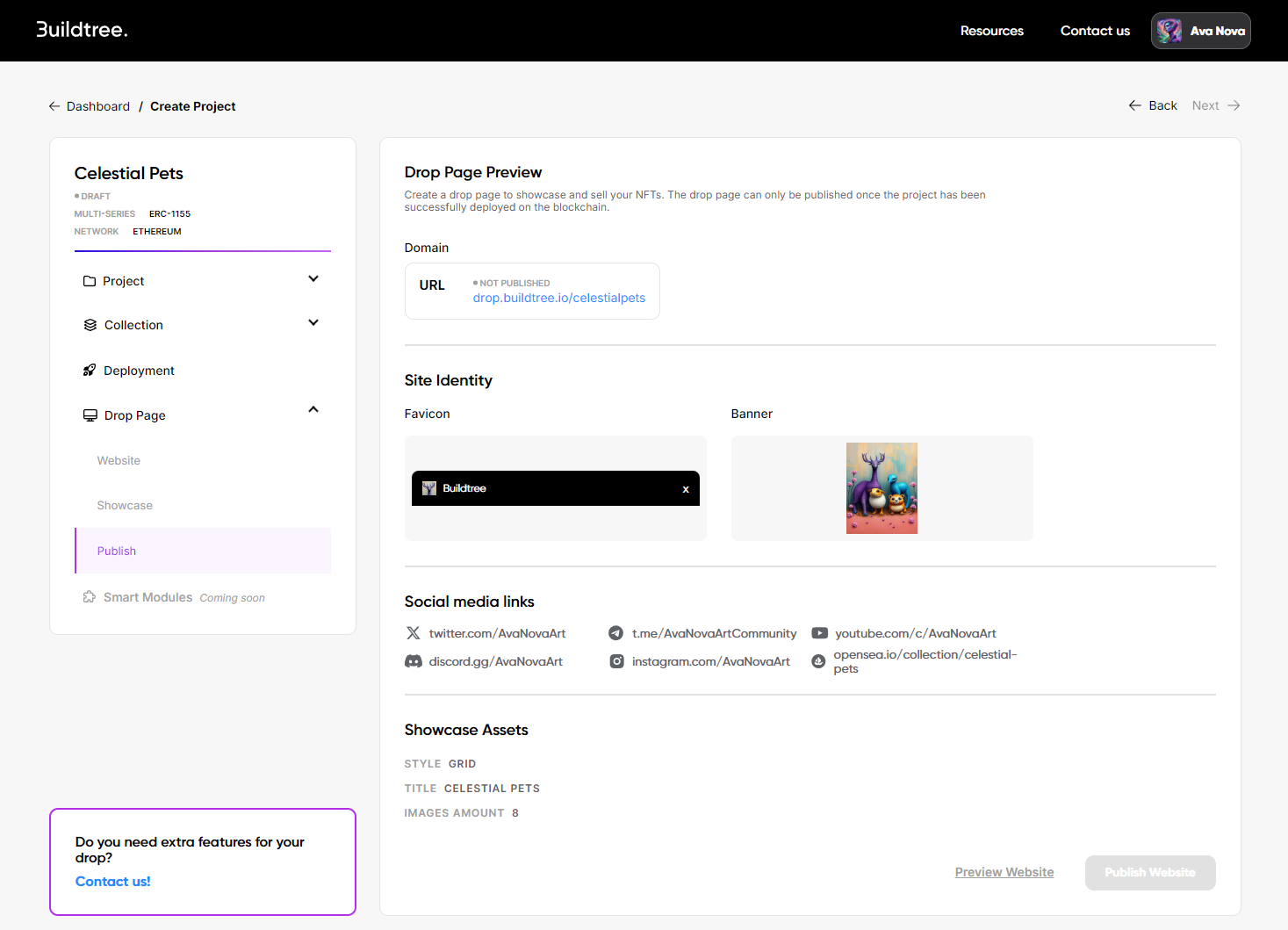 Once you’re satisfied with your review, click Publish Website to make your drop page live. Your drop page will now be accessible via the provided URL, showcasing your project to the world.