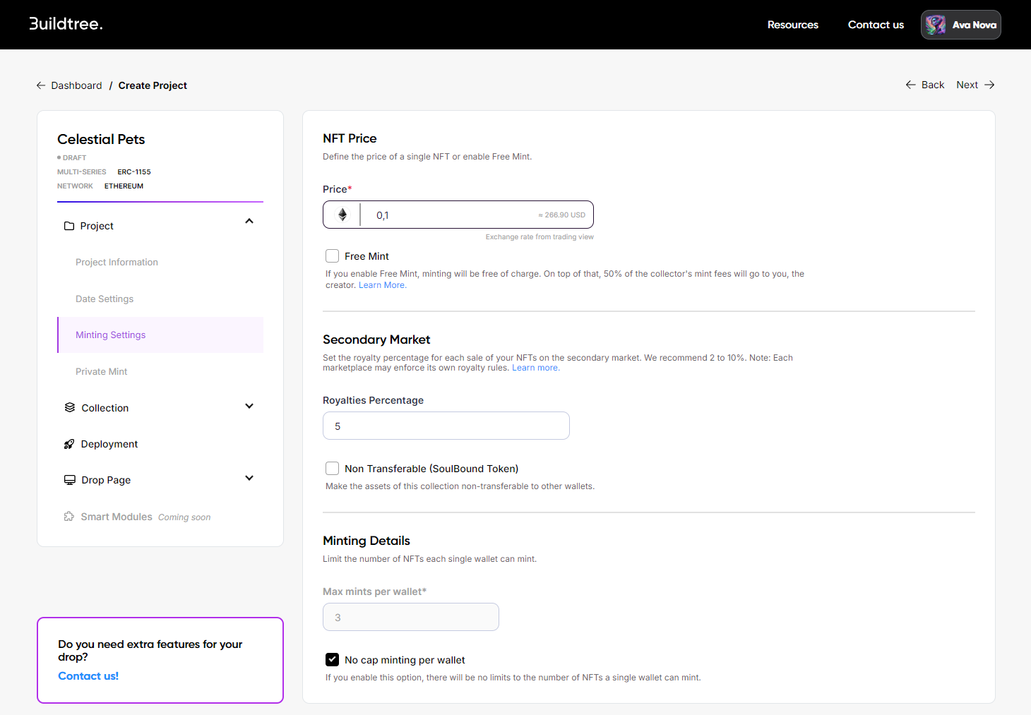 In this section, you can set the price for minting a single token. Buildtree automatically estimates the equivalent price in USD in real time based on the current exchange rate.