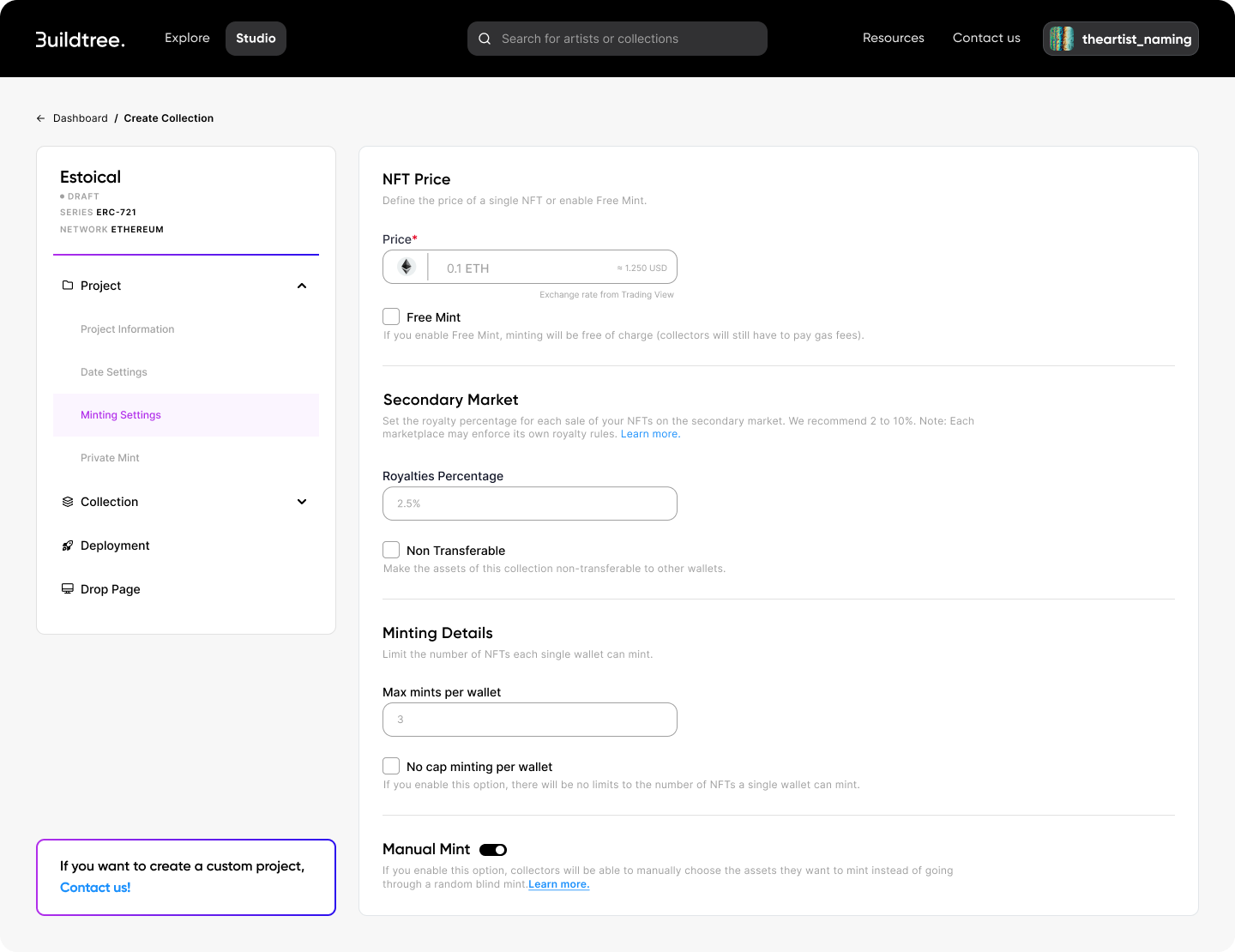 To activate this feature, simply toggle the Manual Mint option within your project's Minting Settings.