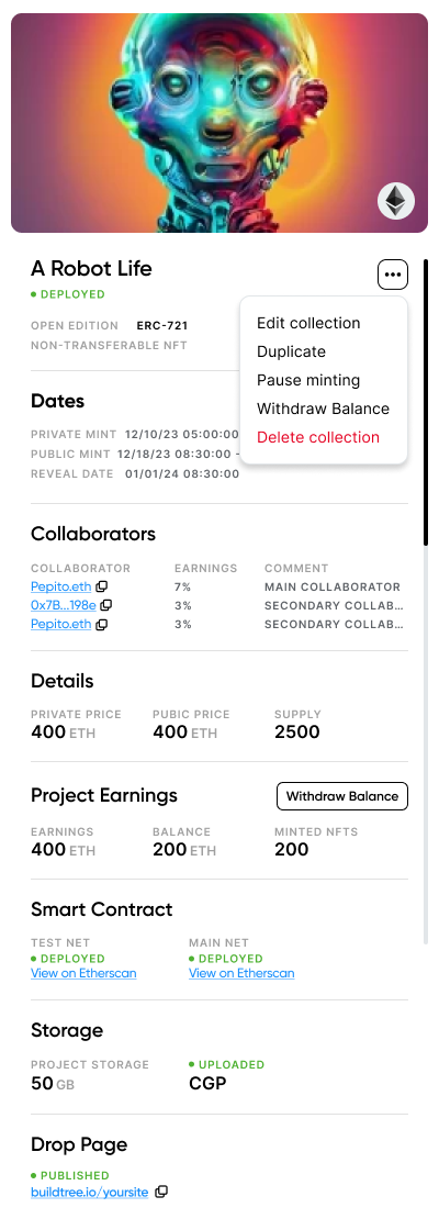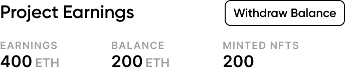 Creators can withdraw the earnings generated from their projects directly from the smart contract to their wallets. Whether the earnings are from NFT sales or mint fees, funds remain in the smart contract until the creator initiates a withdrawal.