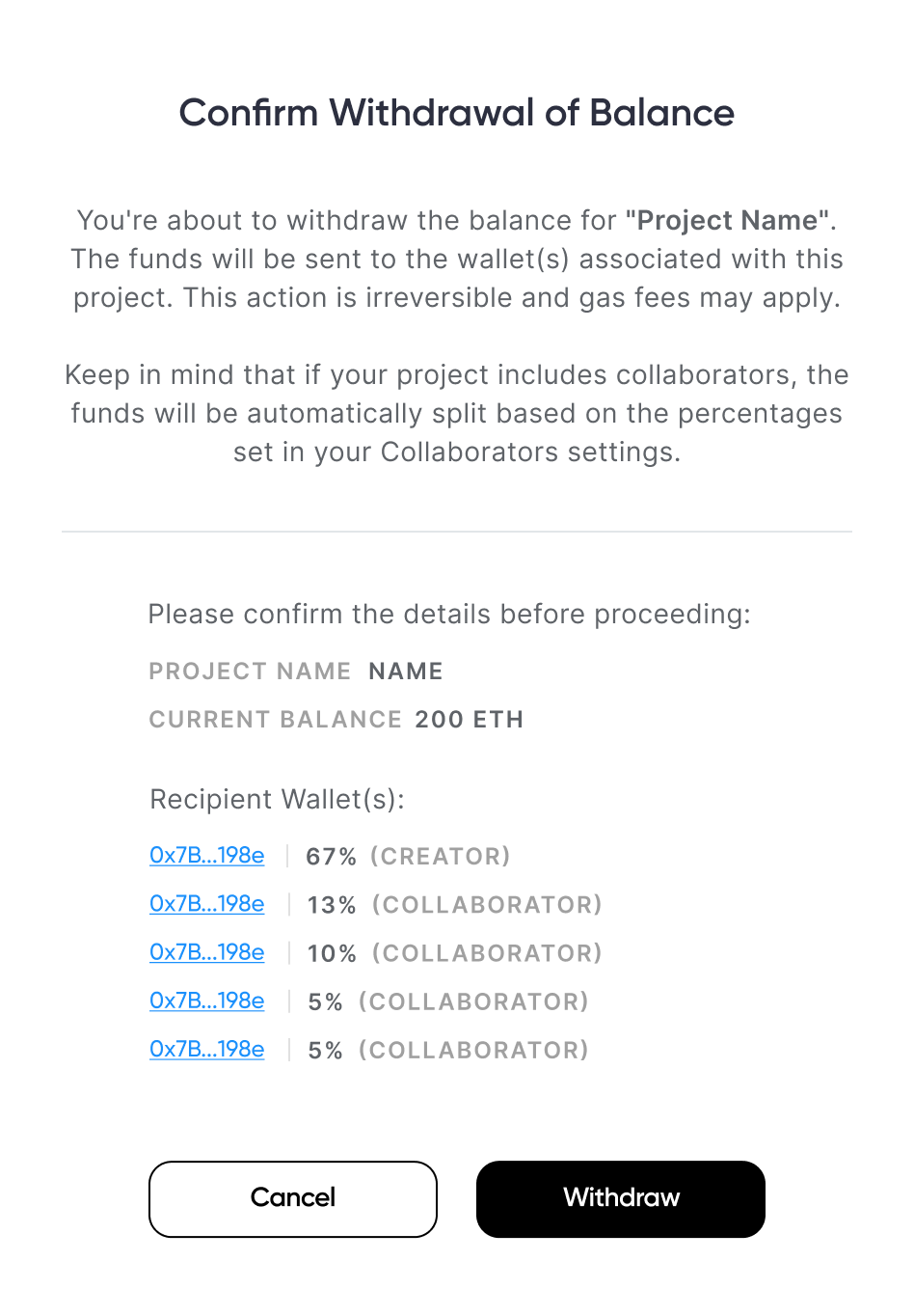 Collaborators will receive their designated share of the earnings automatically when the creator completes the withdrawal process.